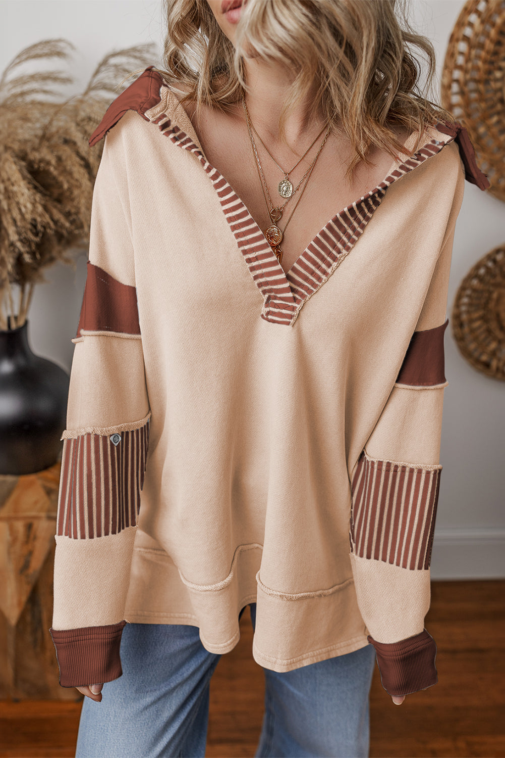 Dark Blue Striped Patchwork Collar Sweatshirt